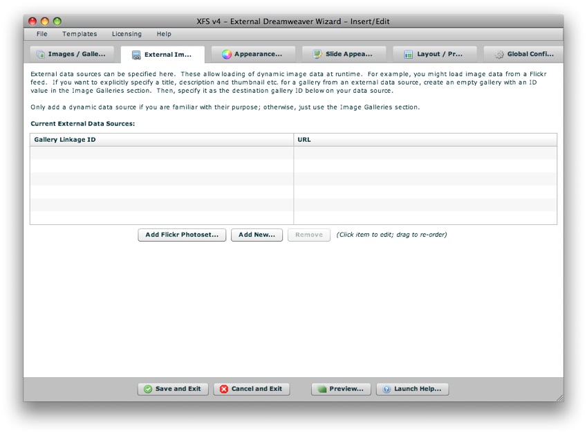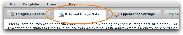 Once you understand the concept of dynamic data sources and have either created or located a data source, you're ready to add it in the wizard. This is done in the main 'External Image Data' tab of the wizard. It appears as follows: