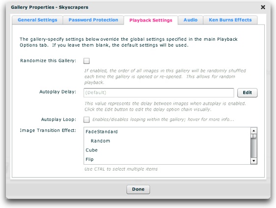 These settings allow you to override the global playback settings (as specified in the main 'Global Configuration & Playback Settings' tab) on a per-gallery basis. For more detailed information about these settings, see the Using the 'Global Configuration and Playback Settings' Section area of the manual.