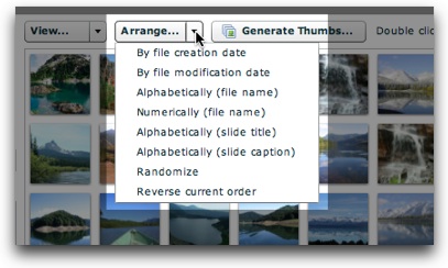 Note that all of the options in this menu -- including Randomize -- only randomize the order of the images in the grid. In other words, this is only a design-time randomization. For true randomization at runtime, you must enable randomization in the main Global Configuration / Playback Settings tab. The 'Alphabetically (slide title)' and 'Alphabetically (slide caption)' options can sort the images based on the image caption and title values you have specified for each image in the Image Properties dialog. The 'Numerically (file name)' option sorts based on the first group of numbers found in the file name, similar to the default sort on many operating systems.