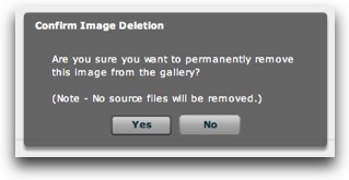 As noted in the message, removing an image from the gallery cannot be instantaneously 'undone'. Any image-specific properties which were set will be lost. Also, keep in mind that the slideshow's configuration is the only thing modified when images are removed; no source files are modified. Thus, you can re-add the images at a later time if desired. If you allow the image removal, a notification will be displayed confirming the removal: