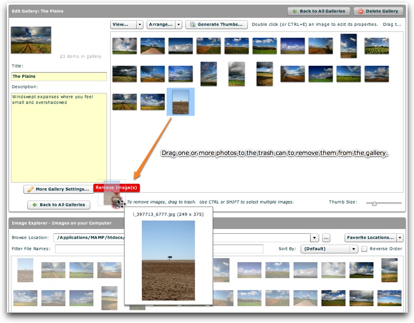 This topic covers the process of adding photos to your gallery, customizing their setup within the gallery, then managing the options for each photo. Automatic thumbnail generation is also covered.