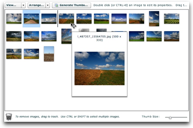 To remove or re-order more than one image, you must select multiple images before dragging dropping them. Just as in the Image Explorer pane, you will use the CTRL (CMD on Macintosh) or SHIFT keys to select multiple images. The CTRL key allows you to select multiple images one-by-one, whereas the SHIFT key allows you to select all images between the current selection and the place where you click with the SHIFT key down. You can then use the CTRL key to modify the selection if you want to exclude some images within the selected block. Once you have made a selection, the selection can be dragged in the same manner as which a single image can be dragged.