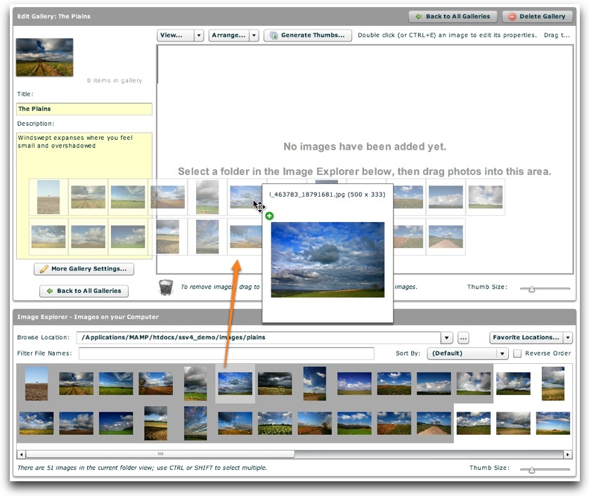 To add the selected images to the gallery, simply drag and drop them from the Image Explorer into the images grid above: