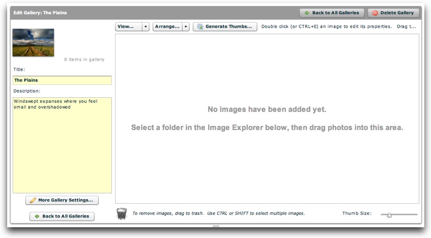 Now for the moment you've been waiting for -- you have a gallery, and you're ready to add some images to it. You should have double-clicked on the gallery and be in single-gallery-edit view, like this: