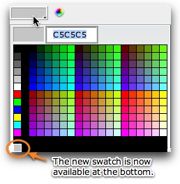 Swatches allow you to store commonly used colors for one-click access from the color swatch menu on the color picker. To add a color to the swatches list, click the Add Swatch button after selecting the color you want to store. It will appear in the Custom Color Swatches section: