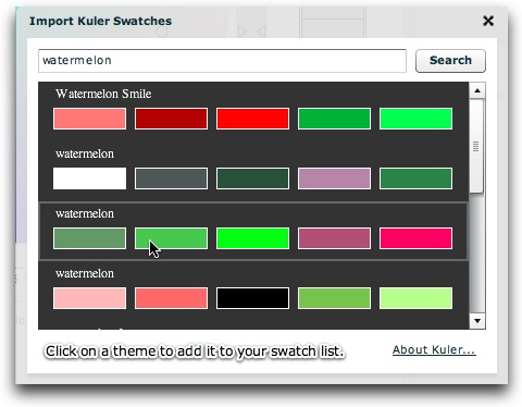 Kuler, by Adobe, is a collaborative service which allows for free sharing of 5-color color schemes. You can use the Kuler Import feature to directly add these 5-color schemes to your swatch panel. To begin, click the Kuler Import button at the bottom of the Color Mixer dialog: